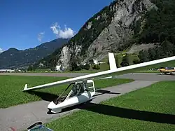 The controls are conventional, with a stick for ailerons and elevator and rudder pedals. The aircraft uses flaps for glidepath control, which function as airbrakes when set to 45-70 degrees. A ballistic parachute with an area of 62 m2 (670 sq ft) is also fitted. The aircraft can be rigged for flight by one person in 15 minutes. It has been launched by foot, aero-tow,[5] bungee launch,[6] auto-tow[7] and winch-launch. Typically take-off and landing are on the main wheel. For foot launch, the bottom cover is opened to stick the legs out. A foot landing has been performed to achieve the FAA class 2 certification.
