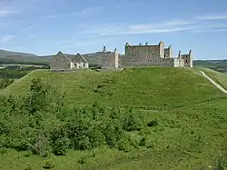 Ruthven Barracks (/ˈrɪvən/), near Ruthven in Badenoch, Scotland, are the best preserved of the four barracks built in 1719 after the 1715 Jacobite rising. Set on an old castle mound, the complex comprises two large three-storey blocks occupying two sides of the enclosure, each with two rooms per floor. The barracks and enclosing walls were built with loopholes for musket firing, and bastion towers were built at opposite corners. Destroyed by Jacobites following their retreat after the Battle of Culloden in 1746, the Barracks ruins are maintained as a scheduled monument by Historic Environment Scotland. They are accessible at all times without entrance charge.