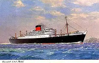 Media and her sister ship Parthia were the first ships built for Cunard after the conclusion of World War II, and were built for transatlantic service between Liverpool and New York City.[3] Media's maiden voyage began on 20 August 1947 from Liverpool.[3] She received a major refit in 1953, part of which was the introduction of stabilisers; Media was the first ship on the transatlantic route so equipped.[3][4] She continued on the transatlantic trade through the late 1950s, by which time competition from jet airliners had cut into her passenger trade, and newer, faster cargo ships had done the same to her cargo trade.[1][3]