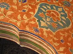 The palace, built by the noblemen of the court of the royal family, is located near the Samode village on the outskirts of Shekhawat. It is built of sandstone at the foot of the Aravalli range of hills (the foremost mountain range of north-western India) with a fortress-like setting. The interiors of the palace are composed in the ancient architectural style of Rajasthan: marble floors, intricately ornamented pillars, mosaic walls (with tiny pieces of small inlaid stones), with luxurious carpets, and decorated with old wall paintings (hunting scenes, floral motifs and so forth). At the entrance gate of the palace is a unique piece of a large-sized treasure chest made of dark wood with marble settings and gleaming glass. The Sheesh Mahal (Hall of Mirrors) is located on the southern side of the palace.[3][9] The frescoes in the Durbar Hall and in the Sultan Mahal are said to be 250 years old.[2] The palace is built on three levels (planned in a sequence of courtyards of increasing height) with a patio on each floor. There is an old ruined fort above the palace from where a panoramic view of the valley could be seen. The fort area is overgrown with vegetation but stone paved paths have been built to reach the fort heights.[5][10] Samode fort was the former residence of the Maharaja. It is said that an underground passage links it to the palace that provided access at times of emergency. It is now approached by a well laid out stone paved path (300 steps). There is also an entry gate to the ruined fort. Two other forts close by complete the circuit of a circular walk from and back to the palace. There is also a small temple, 3 kilometres away from the fort.[3][11]