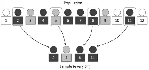 Systematic sampling (also known as interval sampling) relies on arranging the study population according to some ordering scheme, and then selecting elements at regular intervals through that ordered list. Systematic sampling involves a random start and then proceeds with the selection of every kth element from then onwards. In this case, k=(population size/sample size). It is important that the starting point is not automatically the first in the list, but is instead randomly chosen from within the first to the kth element in the list. A simple example would be to select every 10th name from the telephone directory (an 'every 10th' sample, also referred to as 'sampling with a skip of 10').