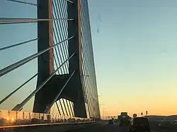 The Samuel-De Champlain Bridge, colloquially known as the Champlain Bridge, is a cable-stayed bridge design by architect Poul Ove Jensen and built to replace the original Champlain Bridge over the Saint Lawrence River in Quebec, between Nuns' Island in the borough of Verdun in Montreal and the suburban city of Brossard on the South Shore. A second, connected bridge links Nuns' Island to the main Island of Montreal. It is the busiest bridge in Canada.[5]