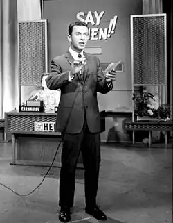 Say When!! is an American game show hosted by Art James that aired on NBC television from January 2, 1961, to March 26, 1965. The show was a Mark Goodson-Bill Todman production and James' only game show for them. Wayne Howell was the announcer, with occasional substitution by Roger Tuttle, Mel Brandt, and Fred Collins.[1] The models alternatingly consisted of Ruth Halsey, Emily Banks, Gunilla Knutson, Carolyn White, Kristan Johnson, and Elizabeth Ames. Carmen Mastren was the show's music director.[1]
