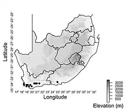 The distribution of Schoenus quadrangularis ranges from the Cape Peninsula in the west to the Groot Winterhook Mountains in the Eastern Cape Province of southern South Africa.[1] This species has been mostly observed growing in damp sites in the mountains, with elevations ranging from 82-1370 m.[1]