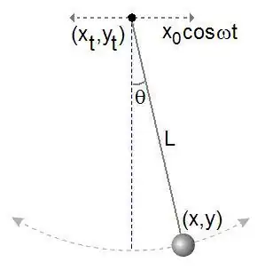 Take a more complicated example. Refer to the next figure at right, Assume the top end of the string is attached to a pivot point undergoing a simple harmonic motion