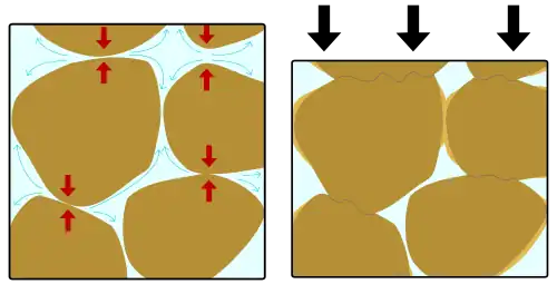 Pressure solution at work in a clastic rock. While material dissolves at places where grains are in contact, that material may recrystallize from the solution and act as cement in open pore spaces. As a result, there is a net flow of material from areas under high stress to those under low stress, producing a sedimentary rock that is harder and more compact. Loose sand can become sandstone in this way.
