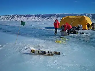 An example of SBL technology is currently (since 2007) underway in Antarctica, where the Moss Landing Marine Laboratory is using a PILOT SBL system to guide the SCINI remotely operated vehicle. SCINI (figure 2) is a small, torpedo-shaped tethered vehicle (ROV) designed for rapid and uncomplicated deployment and exploration of remote sites around Antarctica, including Heald Island, Cape Evans and Bay of Sails. SCINI system is designed to be compact and light-weight so as to facilitate rapid deployment by helicopter, tracked vehicle and even man-hauled sleds. Once on site, its torpedo shaped body allows it to access the ocean through small (20 cm dia.) holes drilled into the sea ice. The mission's science goals[7] however demand high accuracy in navigation, to support tasks including running 10-m video transects (straight lines), providing precise positions for still images to document the distribution and population density of benthic organisms and marking and re-visiting sites for further investigation.