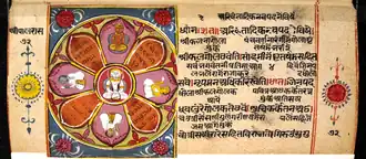 Siddhachakra is a popular yantra or mandala (mystical diagram) used for worship in Jainism.[1][2] It is also known as Navapada in the Śvetāmbara tradition and Navadevta in the Digambara tradition. In the Śvetāmbara tradition it is associated with the Namokar Mantra.[3][4][5][6] It is related to the legend of King Shripala and his wife Mayanasundari. It is depicted as a Kalasha with the core of a blossomed lotus representing Navapada in the centre surrounded by guarding deities on petals. It is used in some rituals.