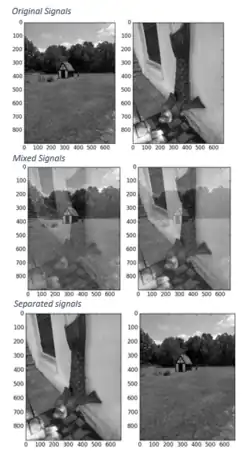 Figure 2 shows the basic concept of BSS. The individual source signals are shown as well as the mixed signals which are received signals. BSS is used to separate the mixed signals with only knowing mixed signals and nothing about original signal or how they were mixed. The separated signals are only approximations of the source signals. The separated images, were separated using Python and the Shogun toolbox using Joint Approximation Diagonalization of Eigen-matrices (JADE) algorithm which is based on independent component analysis, ICA.[1] This toolbox method can be used with multi-dimensions but for an easy visual aspect images(2-D) were used.