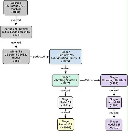 The design of the model 27 series began with Allen B. Wilson, who invented the vibrating shuttle in 1850 and sold machines built around it. Two decades later, when the patents had expired and the Sewing Machine Combination patent pool had dispersed, White Sewing Machine Company employees D'Arcy Porter and George W. Baker built a new machine that made successful use of it. The "White Sewing Machine", as it was first named, entered production in 1876. It was popular in its time, and some of them remain.[d]