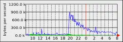 Few definitive numbers exist regarding the precise magnitude of the Slashdot effect, but estimates put the peak of the mass influx of page requests at anywhere from several hundred to several thousand hits per minute.[8][9][10] The flood usually peaked when the article was at the top of the site's front page and gradually subsided as the story was superseded by newer items. Traffic usually remained at elevated levels until the article was pushed off the front page, which could take from 12 to 18 hours after its initial posting. However, some articles had significantly longer lifetimes due to the popularity, newsworthiness, or interest in the linked article.