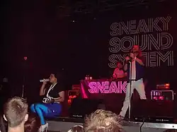 In late 2001, Sneaky Sound System was formed in Sydney as hosts to dance music parties, Sneaky Sundays.[1] Angus McDonald had met MC Double D (Daimon Downey) at a fancy dress party in 2000 and the pair soon became flatmates. Angus was working as a DJ with Damien Hesse and invited D to MC at their regular Sunday parties.[1] Hesse explained their concept "We wanted to start a Sunday night, our own night in Sydney, because we didn't feel we fit into anything else that was going on ... We played for over a year to over 100 people in a basement in Bondi so it was very much an underground thing".[2] Various live musicians would perform irregularly with Sneaky Sound System, the group added cabaret elements including specialist dancers.[1] With Angus on guitar and D on vocoder and vocals, they began gigging at various clubs and festivals along the Australian east coast.[1] They recorded a remix album, Other Peoples Music, produced and engineered by Peter Dolso.[1] The double CD was released on 3 October 2003 by Sony Music Australia. The line-up for the album included Angus, D, Hesse (as a remixer) and Tricky Nick (Nick Broadhurst) on saxophone.[3]