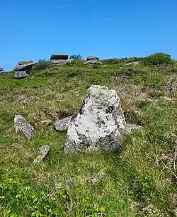 The quoit is situated in rough moorland on the side of Zennor Hill, at about 230 metres above sea level, and is close to several rocky outcrops. About 12 metres in diameter, five stones were found during the excavations, two standing, and three fallen, of which one has eroded to a stump, although due to heavy vegetation and dense gorse, only one upright of the chamber is visible, which is over 1.5 metres tall.[6] It is surrounded on all sides by bracken, gorse, and thick vegetation. The capstone is missing entirely. A cremation pit was discovered during the excavations, and the antechamber faces south.[7][8]
