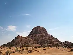 The Spitzkoppe (from German for "pointed dome"; also referred to as Spitzkop, Groot Spitzkop, or the "Matterhorn of Namibia") is a group of bald granite peaks or inselbergs located between Usakos and Swakopmund in the Namib desert of Namibia. The granite is more than 120 million years old and the highest outcrop rises about 1,728 metres (5,669 ft) above sea level. The peaks stand out dramatically from the flat surrounding plains. The highest peak is about 670 m (2,200 ft) above the floor of the desert below. A minor peak – the Little Spitzkoppe – lies nearby at an elevation of 1,557 m (5,108 ft). Other prominences stretch out into a range known as the Pontok Mountains.[1]