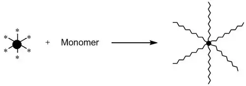 In the core-first approach (also known as the "arm-out" or divergent approach[1]), a multifunctional core serves as the initiator simultaneously for several arms. This approach proves to be more complicated than the arm-first approach, in that finding an appropriate and stable core is difficult, and characterizing the synthesized star-polymer is challenging.[16]