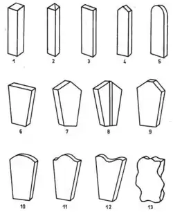 Standing stećaks are mostly cut in the form of columns. This form is very similar to the oldest Muslim nišans without turbans, on which appearance stećaks in the form of columns had a certain influence during stećak to nišan transition period.[6] Columns are nothing more than upright slabs or upright chests. In order for them to stand firmly, they had to be partially buried or dug in, or in local tongue "usaditi" (transl. "planted" – transl. "rooted"), into the ground which is why they are most often called "usađenik". Thus, some columns end with a flat top surface, some as a roof with two or three sides. There are columns that end in a protruding, rounded, barrel-shaped way, as well as those that are arched in that part, lying down. Quite a number of upright slabs are carved so that they gradually widen from the bottom upwards. And such surfaces have very different finishes. Quite rare examples of columns that look like upright gables have also been found. Amorphous or loosely carved upright stećaks similar to columns have been recorded. The number of columns is about 4% of the total stećak. The fact that the columns are mostly studded in Serbia and eastern Bosnia, and that there are few of them in central Bosnia, and that in western Bosnia, Herzegovina, Montenegro and Croatia they are a very rare or almost completely exceptional phenomenon, clearly shows where this influence, due to the Turkish-Ottoman presence, first reflected. Stećci columns are considered to be a phenomenon of the second half of the 15th and the entire 16th century.