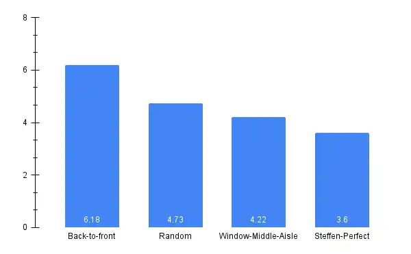In an attempt to rectify this, Jason Steffen conducted simulations and experiments to calculate the mathematically quickest way to board a plane.[1] Steffen used his method on a 72-seat plane in a controlled experiment, finding his results to be faster than the average method.[2]