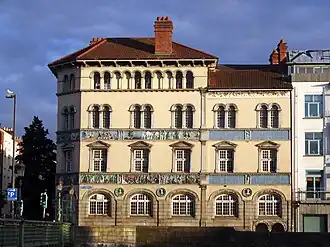 Ould designed the building in the Italianate style. This was unusual for the area,[5] which was dominated by genteel Georgian and Victorian architecture that tended to be externally restrained and internally decorative.[6] According to Ireland's National Inventory of Architectural Heritage, the building is marked by distinctive faience panels that depict the history of soap production. While Essex Quay was laid out in the 1720s, Sunlight Chambers is the oldest remaining structure in the riverside area.[1]