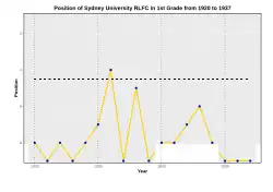 The highlight of the Students' 18 seasons in the NSWRL Premiership was their one and only finals appearance (having finished fourth in the regular season). To get to the Grand Final at the Sydney Agricultural Ground University had to defeat Glebe which they did comfortably 29 - 3.[1] In the Grand Final, however, they were defeated 5–11 by Souths in front of 20,000 people.[2]