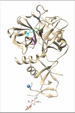 - ^ Huggins DJ (November 2020). "Structural analysis of experimental drugs binding to the SARS-CoV-2 target TMPRSS2". Journal of Molecular Graphics & Modelling. 100 107710. doi:10.1016/j.jmgm.2020.107710. PMC 7417922. PMID 32829149.