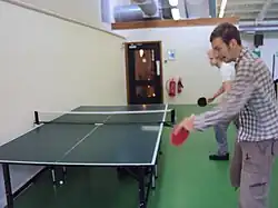 Play begins by playing for serve.[3] The ball is bounced off one player's side of the table, off the wall, off the opposing player's side of the table. The opposing player should then strike the ball so that it bounces straight off the wall and back onto the serving player's side of the table. The server continues and strikes the ball again directly off the wall onto the opponent's side of the table, after this point the point can be won.