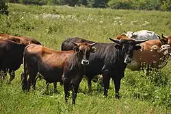 Hortobágy National Park in Hungary has the largest herd of Taurus cattle so far. In 2012, the herd counted 500–600 individuals of which around 200 are mature cows.[7] In addition to crossbred cattle that were imported from Germany, Ankole-Watusi, Hungarian Grey cattle crosses and one half-Holstein Friesian cow are used.[8] There are two sub-herds, a main herd at Pentezug and another one at Karácsonyfok.[9] Studies in the national park showed that cattle are less adapted to dry, cold grasslands than the park's Przewalski horses, and until a few years ago the cattle were supplementary fed.[9][10] The winter of 2011 was the first winter in which additional food was not necessary.[11]