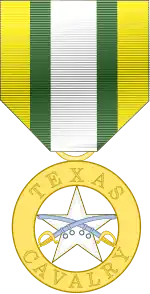 | Description | The ribbon drape is of yellow, green and white stripes. The medal consists of crossed swords over a white star within a gold circle. Upon the gold circle are the words "Texas Cavalry". |