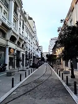 The last few decades of Ottoman control over the city were an era of revival, particularly in terms of the city's infrastructure. It was at that time that the Ottoman administration of the city acquired an "official" face with the creation of the Government House[111] while a number of new public buildings were built in the eclectic style in order to project the European face both of Thessaloniki and the Ottoman Empire.[111][112] The city walls were torn down between 1869 and 1889,[113] efforts for a planned expansion of the city are evident as early as 1879,[114] the first tram service started in 1888[115] and the city streets were illuminated with electric lamp posts in 1908.[116] In 1888, the Oriental Railway connected Thessaloniki to Central Europe via rail through Belgrade and to Monastir in 1893, while the Thessaloniki–Istanbul Junction Railway connected it to Constantinople in 1896.[114]