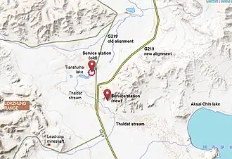 The Xinjiang–Tibet Highway of the 1950s was laid close to the lake, and an army service station was built on its banks, called the Tianshuihai service station.[9][10] Around 2000, an improved national highway (G219) was laid on a new alignment further to the east, and the Tianshuihai service station was moved to a new location, closer to the new alignment.