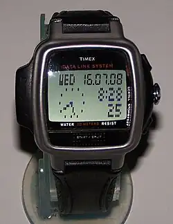 Timex Datalink or Timex Data Link is a line of early smartwatches manufactured by Timex and is considered a wristwatch computer.[1] It is the first watch capable of downloading information wirelessly from a computer.[2][3] As the name implies, datalink watches are capable of data transfer through linking with a computer.[4] The Datalink line was introduced in 1994 and it was co-developed with Microsoft as a wearable alternative to mainstream PDAs with additional attributes such as water resistance, that PDAs lacked, and easy programmability.[5] The watch was demonstrated by Bill Gates on 21 June 1994 in a presentation where he downloaded information from a computer monitor using bars of light and then showed to the audience the downloaded appointments and other data.[6] The early models included models 50, 70, 150 and model 150s (small size).[5] The model numbers indicated the approximate number of phone numbers that could be stored in the watch memory.[7] These early models were, at the time of their introduction, the only watches to bear the Microsoft logo.[8][9] The watches have been certified by NASA for space travel and have been used by astronauts and cosmonauts in space missions. There had been an evolution over the years as to the number and type of entries that can be stored in the various watch models as well as the mode of data transfer between computer and watch. At the time of its introduction the watch was considered high-tech.[10]