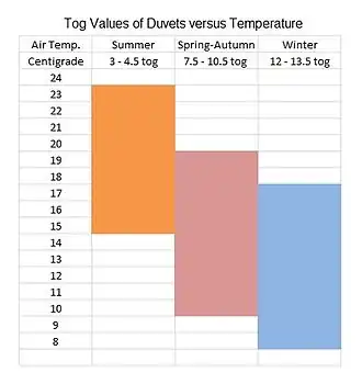 British duvets are sold in steps of 1.5 tog from 3.0 tog (summer) to 16.5 tog (extra-warm). The stated values are a minimum; actual values may be up to 3 tog higher. Also, these values assume that there is no added duvet cover that can trap air.