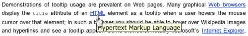 Demonstrations of tooltip usage are prevalent on web pages. Many graphical web browsers display the title attribute of an HTML element as a tooltip when a user hovers the pointer over that element; in such a browser, when hovering over Wikipedia images and hyperlinks a tooltip will appear.[9]