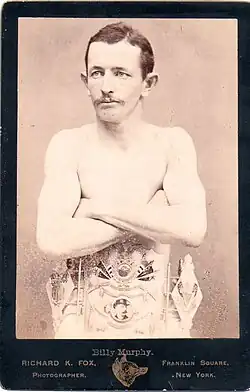 In an important bout on 30 July 1889, he fought a twenty-seven round draw against English champion Frank Murphy in what was billed as a World 120 pound title match. The bout was fought at the California Athletic Club in San Francisco for a purse of $1,800.[2][3] In a close fight, Frank Murphy was down twice in the fifteenth, but had the better of the seventeenth through nineteenth rounds. Frank Murphy was down again in the twenty-second round. The fight was stopped by Referee Cook with the help of the police in the twenty-seventh because neither men appeared to be able to continue the match. Upon examination in their dressing rooms after the match, Billy Murphy was found to have a fracture of the radius of his left arm, and Frank Murphy's wrist was swollen and bruised. Torpedo Billy paused in his boxing schedule for five months to recover.[4] From the twentieth through the final twenty-seventh round, both men appeared fatigued and did far less fighting than the first twenty rounds.[5]