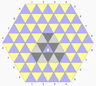 The starting setup is as shown. As in chess, White moves first, and the object is checkmate. Other standard conventions apply as well, including castling, the pawn's initial two-step move, the en passant capture, and promotion at the last rank. The triangular geometry, however, implies special move patterns for the pieces.