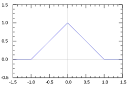 A triangular function (also known as a triangle function , hat function , or tent function ) is a function whose graph takes the shape of a triangle. Often this is an isosceles triangle of height 1 and base 2 in which case it is referred to as the triangular function. Triangular functions are useful in signal processing and communication systems engineering as representations of idealized signals, and the triangular function specifically as an integral transform kernel function from which more realistic signals can be derived, for example in kernel density estimation . It also has applications in pulse-code modulation as a pulse shape for transmitting digital signals and as a matched filter for receiving the signals. It is also used to define the triangular window sometimes called the Bartlett window .