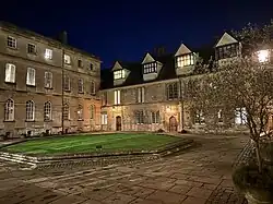 The front quadrangle between the Durham quadrangle and Broad Street was formed by the new buildings (1883–1885) and the president's lodgings (1885–1887), both designed by Thomas Graham Jackson. It also includes some older buildings on Broad Street: four old cottages and Kettell Hall, a stone house built by President Ralph Kettell in around 1620.[25]