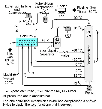 The gas stream from the gas–liquid separator enters the turboexpander, where it undergoes an isentropic expansion from an absolute pressure of 62 bar to 21 bar (6.2 to 2.1 MPa) that lowers the gas stream temperature from about −51 °C to about −91 °C as it enters the demethanizer to serve as distillation reflux.