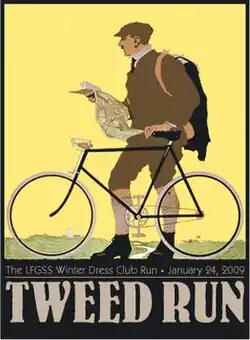 The Tweed Run is a group bicycle living history ride through the centre of London, in which the cyclists are expected to dress in retro style traditional British cycling attire, particularly tweed plus four suits. Any bicycle is acceptable on the Tweed Run, but classic vintage bicycles are encouraged. Some effort to recreate the spirit of a bygone era is always appreciated.[1] The ride dubs itself "A Metropolitan Cycle Ride With a Bit of Style."
