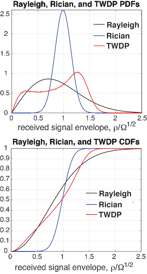 The new system predicts a number of deep fading scenarios that are not found in the older methods, notably Rayleigh. Jeff Frolik was the first to measure TWDP fading in an aircraft fuselage, coining the term hyper-Rayleigh to denote this and other fading scenarios that result in worse-than-Rayleigh received power outages for a radio link.[6] Subsequently, other researchers have developed alternate, improved expressions for the TWDP distribution and its statistics.[7][8] Recently, TWDP fading has been discovered for directional and vehicular millimeter wave channels.[9][10]