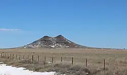 Two Buttes is a dual-peaked mountain in Prowers County, Colorado. The two peaks, which are the highest point in Prowers County, rise about 300 feet (91 m) above the mostly flat Great Plains that surround them, making them visible for miles. The south peak is about 30 feet (9.1 m) higher than the north one, and both are connected by a saddle.[3]