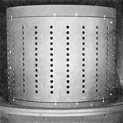 The cylinder was 70 in. OD x 23 in. ID x 39 in. high. The core had 312 fuel channels. The channels were equally spaced radially around the core at 15 degree intervals arranged in 13 separate layers of 24 channels each. Each channel held up to 4 fuel elements and extended completely through to the inside of the cylinder. The core could be refueled remotely while at full power.[4] Refueling involved rotating the core to the channel containing the element requiring replacement and pushing in a new element. The used element would be pushed out into the center and fall to the base of the reactor to be collected. At full power the reactor used up 1 to 6 fuel elements per day depending on enrichment and porosity of the fuel element. It produced 3MW of thermal energy.