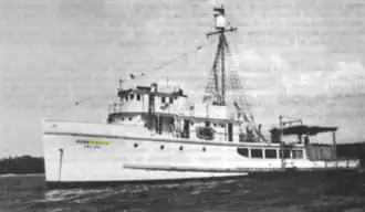 In 1954, Hugh M. Smith shifted to a new focus as the FWS sought information on the largely unexplored albacore fishing grounds of the North Pacific Ocean to the north and east of Hawaii.[52] To compliment an exploratory fishing cruise US FWS John R. Manning made in the area, Hugh M. Smith conducted a 53-day hydrographic cruise — her 25th FWS cruise — in the North Pacific in early 1954.[52] She occupied 89 hydrographic stations, at each of which she took water samples for chemical analysis at 13 different depths ranging from the surface to 4,000 feet (1,219 m), took bathythermograph readings, and made plankton tows from the surface to a depth of 600 feet (183 m) to sample zooplankton.[52] She took additional bathythermograph readings in between the stations, gathering data on the subsurface temperature structure of the region.[52] She also used an underway current meter to measure surface currents.[52] It was the most thorough oceanographic study of the area ever made up to that time,[52] completing the FWS survey of the area begun by John R. Manning.[52] Hugh M. Smith returned to Pearl Harbor on 17 March 1954.[52]