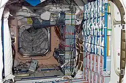 Essential space station resources such as fluids, environmental control and life support systems, electrical and data systems are routed through Unity to supply work and living areas of the station. More than 50,000 mechanical items, 216 lines to carry fluids and gases, and 121 internal and external electrical cables using six miles of wire were installed in the Unity node.[2] The primary structure of Unity is constructed of aluminium.[3]