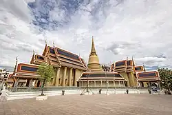 The temple features a unique layout, with its wihan and ubosot joined by a circular courtyard, at the center of which stands a gilded chedi. The golden chedi (43m high) is covered with orange-coloured tiles and on top of the chedi, there is a golden ball. There is a relic of Buddha inside and the chedi was built in Sri Lankan style.[1] The ordination hall has 10 door panels and 28 window panels each decorated with gilded black lacquer on the inside.[2]