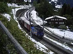 The Wengernalp Railway (German: Wengernalpbahn, WAB) is a 19.11 kilometres (11.87 mi) long rack railway line in Switzerland. It runs from Lauterbrunnen to Grindelwald via Wengen and Kleine Scheidegg, making it the world's longest continuous rack and pinion railway.[1] The name refers to the alpine meadow of Wengernalp, above Wengen.