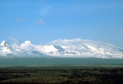 The Wrangell Volcanic Field is a volcanic field stretching from eastern Alaska in the United States to the southwestern Yukon Territory in Canada. The field includes the four highest volcanoes in the United States, Mount Bona, Mount Blackburn, Mount Sanford, and Mount Churchill, all of which exceed 15,000 ft (4,600 m) in elevation. It formed as a result of subduction of the Pacific Plate beneath the North American Plate at the easternmost end of the Aleutian Trench[1][2][3].