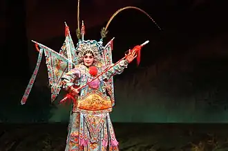 The changkao wudan (simplified Chinese: 长靠武旦; traditional Chinese: 長靠武旦; pinyin: chángkào wǔdàn; lit. 'long-armor wudan'), better known as the daomadan (simplified Chinese: 刀马旦; traditional Chinese: 刀馬旦; pinyin: dāomǎdàn; lit. 'blade-horse female'), is a woman, often an army commander, who fights on horseback in battles. Popular daomadan characters include Mu Guiying from the Generals of the Yang Family and Hu Sanniang from the Water Margin. In Peking opera, the daomadan wears a long "female armor" (女靠, nükào), which is similar to that worn by their male counterparts but with flower and phoenix embroidery as well as multicolored streamers hanging from the waist.[3] The armor is usually in red or pink. The armor restricts movement, so the daomadan is less acrobatic compared to the duanda wudan. For more freedom a "reformed armor" (改良靠, găiliángkào), which lacks the four flags in the back and fits more closely to the body, can be worn.[4] Her helmet is attached to two lingzi (long pheasant feathers). The commonly used weapon is a long-poled dao (blade) or qiang (spear).[5]