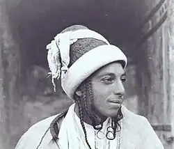Yazidi boy in traditional clothes. In Sinjar, male Yazidis used to wear pigtails.[138]