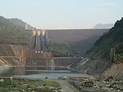The concrete spillway was constructed to the north (right bank) of the dam and consists of a multi-level open channel controlled by three radial gates. Due to a large volume of unstable sandstone, clay and shale that comprised the slope where the spillway was to be built, about 6,040,000 cubic metres (213,000,000 cu ft) of material had to be removed before concrete placement could begin. Construction of the spillway was carried out simultaneously with the main dam. The spillway can discharge up to 9,470 cubic metres per second (334,000 cu ft/s) when all the gates are open.[12] The dam is also equipped with two sluice gates for de-silting operations, and two flood outlet tunnels with 160 cubic metres per second (5,700 cu ft/s) capacity.